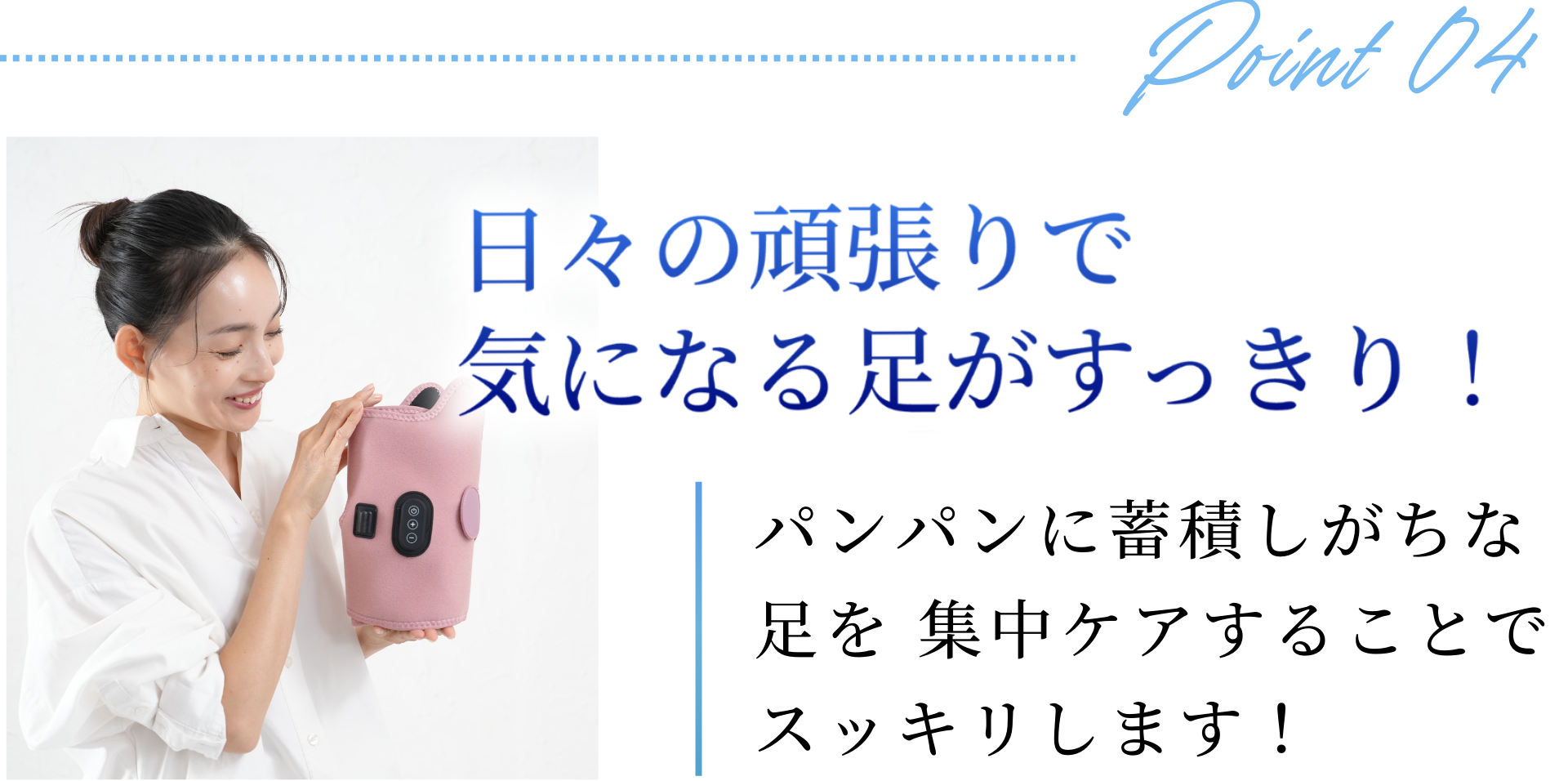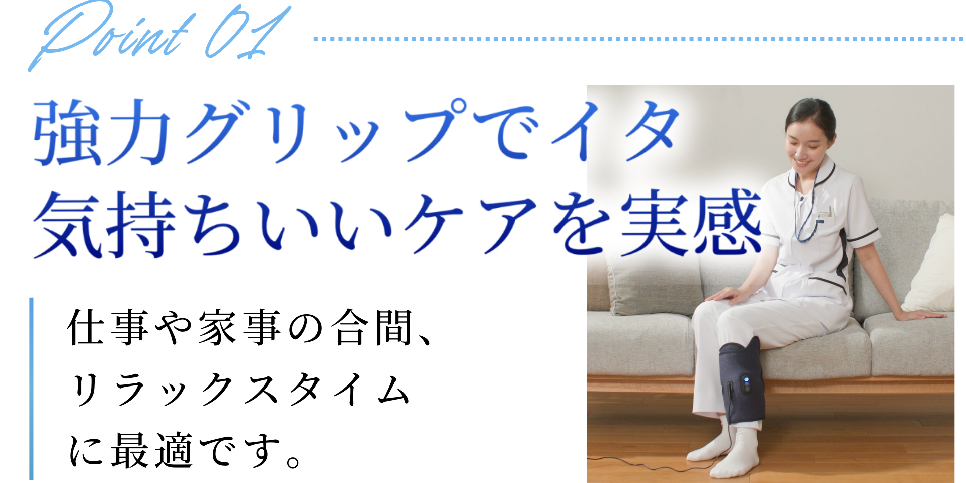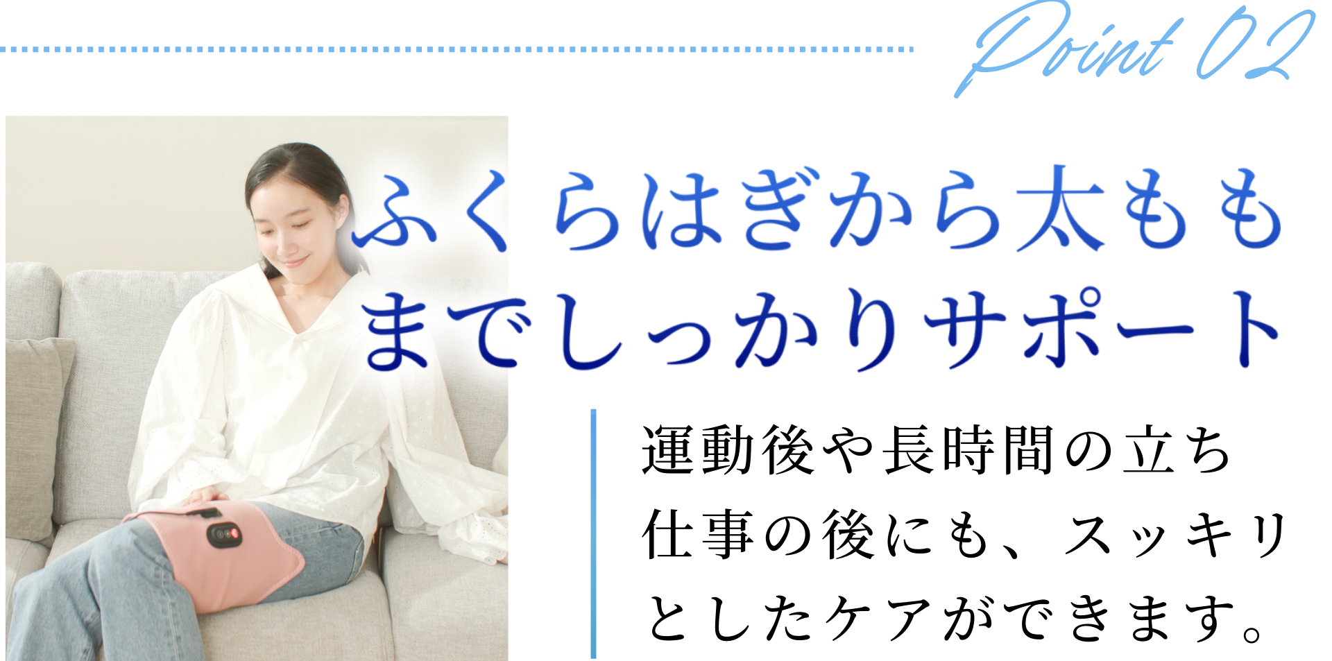 独自のエアポンプがしっかりサポートし、 ふくらはぎや太ももにプロ級のケアを実現。リラックスをお手軽に楽しめるのが魅力です。